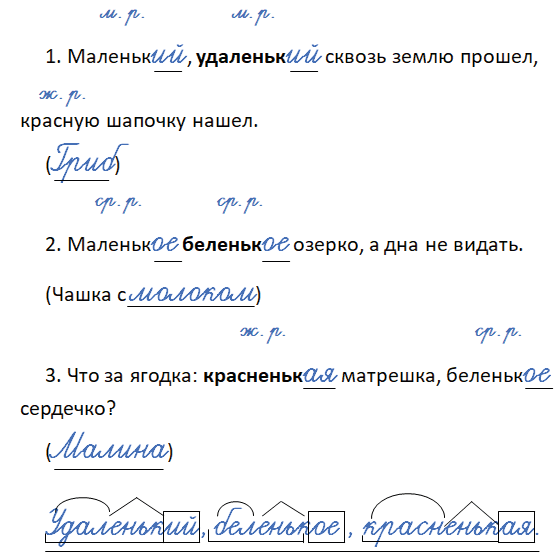 1.Маленький (м. р.), удаленький (м. р.) сквозь землю прошел, красную (ж. р.) шапочку нашел.