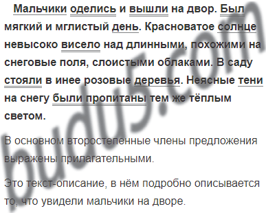 Прочитай отрывок из повести А.Н. Толстого ”Детство Никиты”. Постарайся представить картину, нарисованную словами. Подчеркни главные члены в каждом предложении. Обрати внимание, какой частью речи выражены в основном второстепенные члены предложения. Что представляет собой этот текст – описание или повествование? Почему ты так думаешь? Объясни.