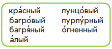 Выпиши однокоренные слова, выдели в них корень. Как называется группа слов в рамке? Какие оттенки красного цвета называют эти имена прилагательные?