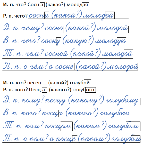 Просклоняйте каждое слово в словосочетаниях молодая сосна и голубой песец. Выделите в словах окончания.