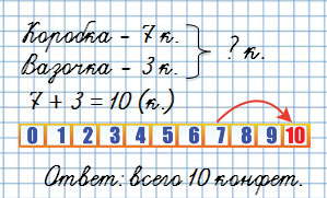 1. 1) В коробке 7 конфет, в вазочке 3 кон­феты. Сколько всего конфет?