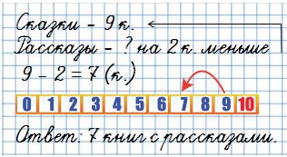 У Кати 9 книг со сказками, а книг с рассказами о животных на 2 меньше. Сколько у Кати книг с рассказами о животных?