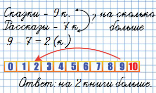 У Кати 9 книг со сказками и 7 книг с рассказами о животных. На сколько больше у Кати книг со сказками, чем с рассказами?
