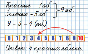 В вазе — зелёные и красные яблоки, всего 9 яблок. Зелёных яблок 5. Сколько красных яблок в вазе?