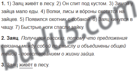 1) Лес, заяц, в, живёт. 2) Куст, он, под, спит. 3) У, зимой, зайца, мало, еда. 4) Зайцы, волки, лисы, вороны, и, на, охотятся. 5) С, охотник, собака, появился. 6) Заяц, чаща, в, кинулся. 7) Ноги, зайка, быстрые, спасли.