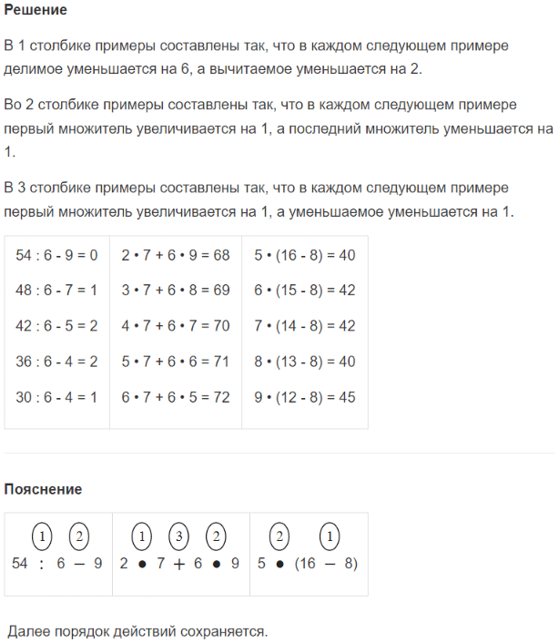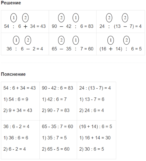 | (60 - 18) : 6 = 7 1) 60 - 18 = 42 2) 42 : 6 = 7 | 4 • 6 : 8 = 3 1) 4 • 6 = 24 2) 24 : 8 = 3 | 40 : 5 • 6 = 48 1) 40 : 5 = 8 2) 8 • 6 = 48 |