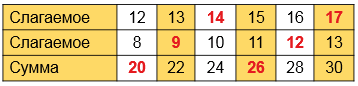 | Слагаемое | 12 | 13 | 14 | 15 | 16 | 17 |