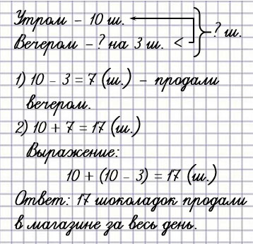 Утром в магазине продали 10 шоколадок, а вечером на 3 шоколадки меньше. Сколько шоколадок продали в магазине за весь день?