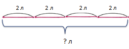 В одном пакете 2 л сока. Сколько литров в четырёх таких пакетах?