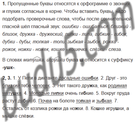 1. У Пети в диктанте досадные оши..ки. 2. Друг — это близкий тебе человек. 3. Нет такого дру..ка, как родимая мату..ка. 4. Молодые ли..ки очень ги..кие. 5. Вокруг пруда растут ду..ки. 6. Почва на болоте то..кая и зы..кая. 7. Остались от козлика ро..ки да но..-ки. 8. Ко..ке игру..ки, а мышке слё..ки.