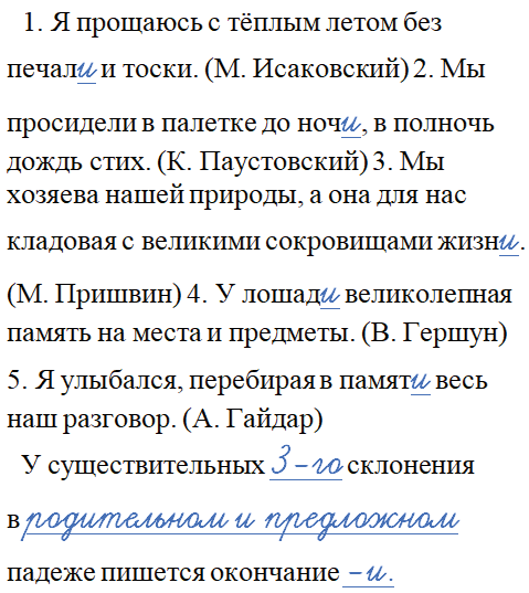 1. Я прощаюсь с тёплым летом без печали и тоски. (М. Исаковский) 2. Мы просидели в палетке до ночи, в полночь дождь стих. (К. Паустовский) 3. Мы хозяева нашей природы, а она для нас кладовая с великими сокровищами жизни. (М. Пришвин) 4. У лошадм великолепная память на места и предметы. (В. Гершун) 5. Я улыбался, перебирая в памяти весь наш разговор. (А. Гайдар)