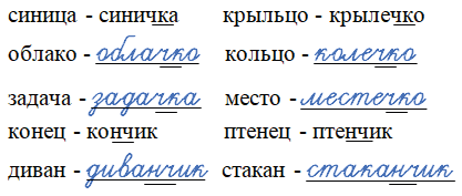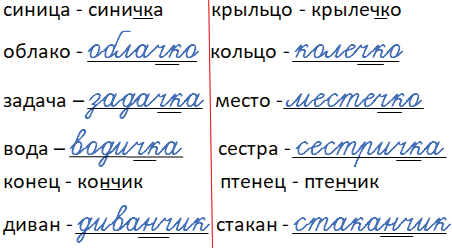 | синица — синичка облако — облачко задача — задачка вода — водичка конец — кончик диван — диванчик | крыльцо — крылечко кольцо — колечко место — местечко сестра — сестричка птенец — птенчик стакан — стаканчик |