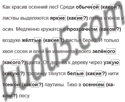 Как красив осенний лес! Среди ... листвы выделяются ... пятна клёнов и осин. Медленно кружатся в ... воздухе ... листья берёз. И только хвоя сосен и елей не изменила своего ... цвета. От дерева к дереву через ... тропинку тянутся ... нити ... паутины. Тихо в ... лесу.