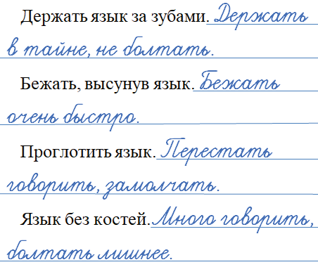 Прочитайте фразеологизмы со словом язык, рядом запишите значение каждого фразеологизма.