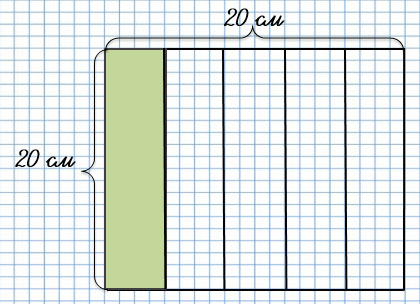 Длина стороны квадрата - 20 см. Эту сторону мы разделили на 5 частей. Значит, чтобы узнать ширину одной прямоугольной части, нужно разделить длину стороны квадрата на 5: