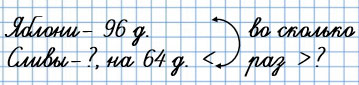 16. В саду посадили 96 яблонь, а слив на 64 дерева меньше. Во сколько раз больше посадили яблонь, чем слив?