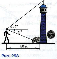 Наблюдатель находится на расстоянии 50 м от башни, высоту которой хочет определить (рис. 298). Основание башни он видит под углом 20 к горизонту, а вершину - под углом 450 к горизонту. Какова высота башни?