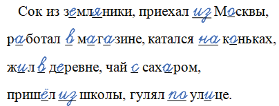 Сок из з_мл_ники, приехал __ М_сквы, р_ботал _ м_г_зине, катался __ к_ньках, ж_л _ д_ревне, чай _ сах_ром, приш_л __ школы, гулял __ ул_це, лист_я __ б_рёзы.