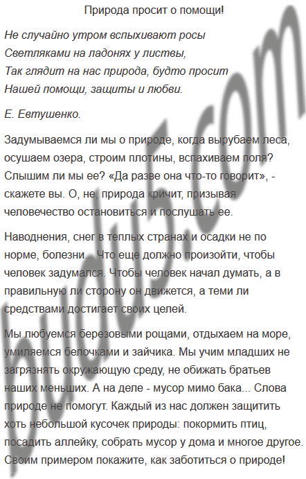 Представьте, что всем классом вы готовите стенгазету, посвящённую теме «Человек и природа». Напишите заметку и расскажите в ней, как живётся деревьям на городских улицах, травам и цветам на газонах, белкам в парках, птицам под крышами наших домов, кошкам и собакам в наших квартирах. Зачем нужны животные в городе? Всегда ли мы внимательны к ним? Что делает или может (должен) сделать каждый из нас, чтобы сохранить природу в городе? Тему уточните самостоятельно. Вы можете использовать в заметке любой тип речи, но стиль речи должен быть публицистическим.