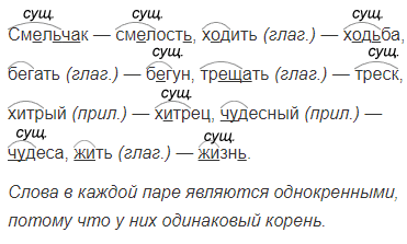 Смельчак (сущ.) — смелость (сущ.), ходить (глаг.) — ходьба (сущ.), бегать (глаг.) — бегун (сущ.), трещать (глаг.) — треск (сущ.), хитрый (прил.) — хитрец (сущ.), чудесный (прил.) — чудеса (сущ.), жить (глаг.) — жизнь (сущ.).