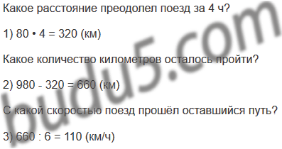 27. Расстояние между городами 980 км. Первые 4 ч поезд шёл со скоростью 80 км/ч. С какой скоростью поезд прошёл оставшийся путь, если он затратил на него 6 ч?