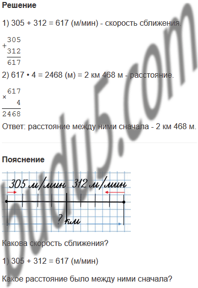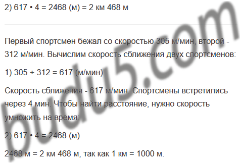 27. Два спортсмена одновременно начали бежать навстречу друг другу. Первый спортсмен бежал со скоростью 305 м/мин, второй - 312 м/мин. Спортсмены встретились через 4 мин. Какое расстояние было между ними сначала?