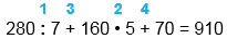 1) 280 : 7 = 40 2) 160 • 5 = 800 3) 40 + 800 = 840 4) 840 + 70 = 910 |