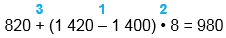 1) 1420 - 1400 = 20 2) 20 • 8 = 160 3) 820 + 160 = 980 |