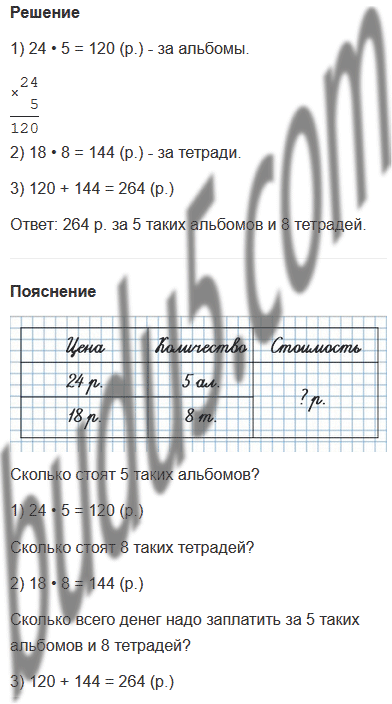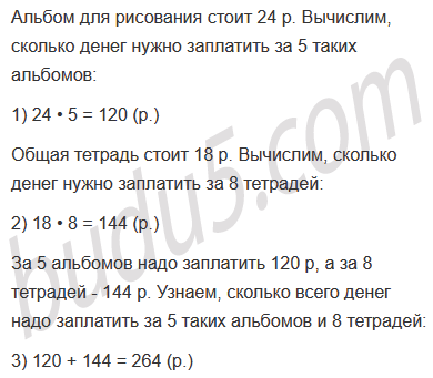 2. Альбом для рисования стоит 24 р., а общая тетрадь 18 р. Сколько всего денег надо заплатить за 5 таких альбомов и 8 тетрадей?