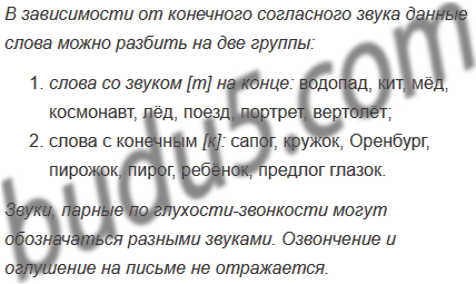 На какие группы в зависимости от конечного согласного звука можно разбить данные ниже слова? Какие свойства согласных звуков нужно при этом учесть?