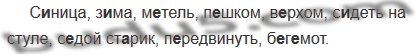 С..ница, з..ма, м..тель, п..шком, в..рхом, с..деть на стуле, с..дой ст..рик, п..вдвинуть, б..г..мот.