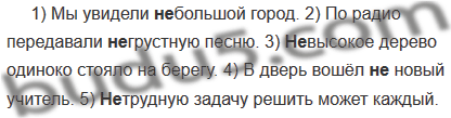1) Мы увидели (не)большой город. (Это был маленький город.) 2) По радио передавали (не)грустную песню. (Это была весёлая песня.) 3) (Не)высокое дерево одиноко стояло на берегу. (Оно действительно было низким.) 4) В дверь вошёл (не)новый учитель. (Перед нами стоял директор школы!) 5) (Не)трудную задачу решить может каждый. (Если она на самом деле лёгкая.)