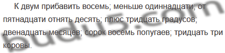 К 2 прибавить 8; меньше 11; от 15 отнять 10; плюс 30 градусов; 12 месяцев; 48 попугаев; 33 коровы.