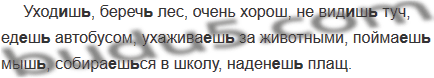 Уход..ш(?), береч(?) лес, очень хорош(?), не вид..ш(?) туч(?), ед..ш(?) автобусом, ухажива..ш(?) за животными, пойма..ш(?) мыш(?), собира..ш(?)ся в школу, наден..ш(?) плащ(?).