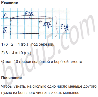 Задание № 6. Под ёлкой 6 грибов, а под берёзой - на 2 меньше. Сколько грибов под ёлкой и берёзой вместе?