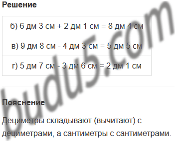 | а) 3 дм 2 см + 1 дм 4 см = 4 дм 6 см |