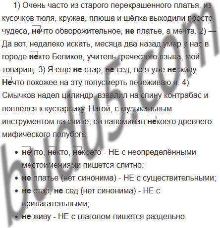 1) Очень часто из старого перекрашенного платья, из кусочков тюля, кружев, плюша и шёлка выходили просто чудеса, (не)что обворожительное, (не)платье, а мечта. 2) — Да вот, недалеко искать, месяца два назад умер у нас в городе (не)кто Беликов, учитель греческого языка, мой товарищ. 3) Я ещё (не)стар, (не)сед, но я уже (не)живу. (Не)что похожее на эту полусмерть переживаю я. 4) Смычков надел цилиндр, взвалил на спину контрабас и поплёлся к кустарнику. Нагой, с музыкальным инструментом на спине, он напоминал (не)коего древнего мифического полубога.
