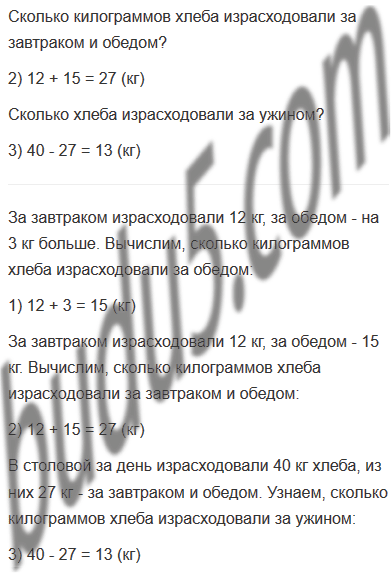 Задание № 4. В столовой за день израсходовали 40 кг хлеба. Из них за завтраком израсходовали 12 кг, за обедом - на 3 кг больше, чем за завтраком, а остальной хлеб израсходовали за ужином. Сколько хлеба израсходовали за ужином?