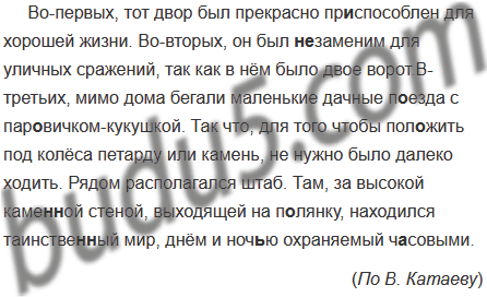 Этот двор был прекрасно пр..способлен для хорошей жизни. Он был (не)заменим для уличных сражений, так как в нём было двое ворот. Мимо дома бегали маленькие дачные п..езда с пар..вичком-кукушкой. Так что, для того чтобы пол..жить под колёса петарду или камень, не нужно было далеко ходить. Рядом располагался штаб. Там, за высокой каме(н, нн)ой стеной, выходящей на п..лянку, находился таинстве(н, нн)ый мир, днём и ноч(?)ю охраняемый ч..совыми. (По В. Катаеву)