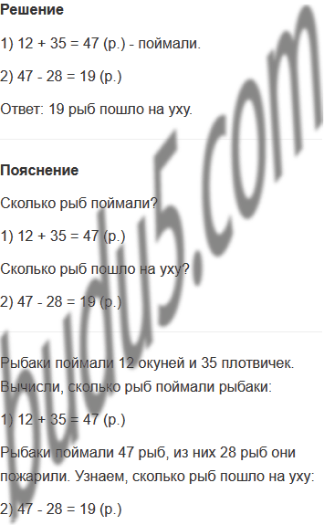 Задание № 6. Рыбаки поймали 12 окуней и 35 плотвичек. Из них 28 рыб они пожарили, а из остальных сварили уху. Сколько рыб пошло на уху?