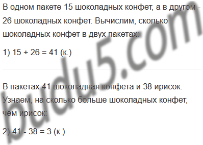 Задание № 4. В одном пакете 15 шоколадных конфет и 38 ирисок, а в другом - 26 шоколадных конфет. Каких конфет больше в этих двух пакетах: шоколадных или ирисок? На сколько больше?