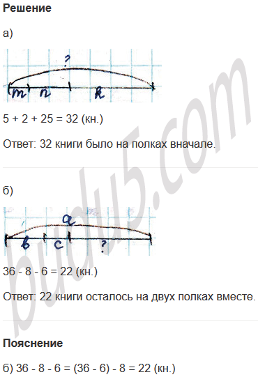 б) На двух полках было а книг. С первой полки взяли b книг, а со второй - с книг. Сколько книг осталось на двух полках вместе? (а = 36, b = 8, с = 6)
