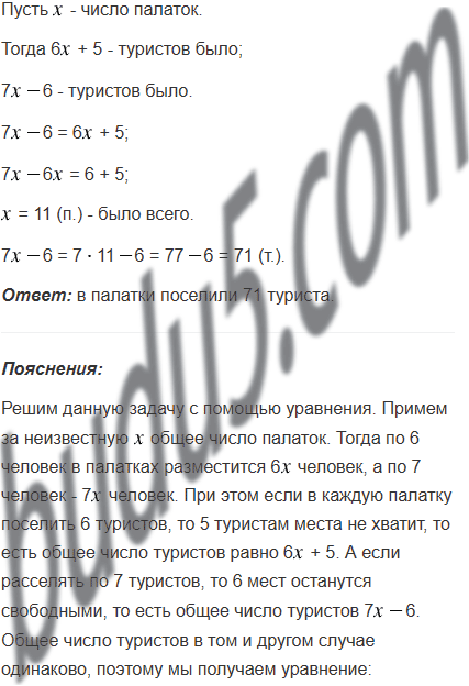 При расселении туристов в палатки оказалось, что если в каждую палатку поселить 6 туристов, то 5 туристам места не хватит, а если расселять по 7 туристов, то 6 мест останутся свободными. Сколько туристов поселили в палатке?