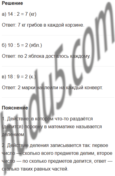 а) 14 кг грибов разложили поровну в 2 корзины. Сколько килограммов грибов в каждой корзине?