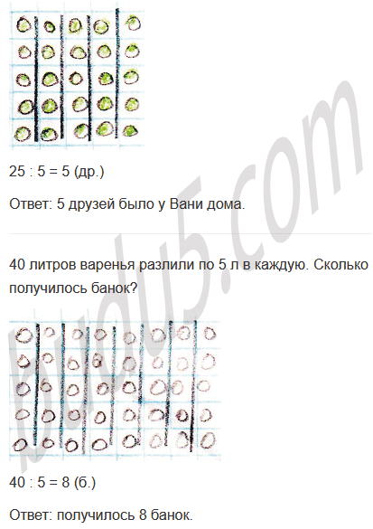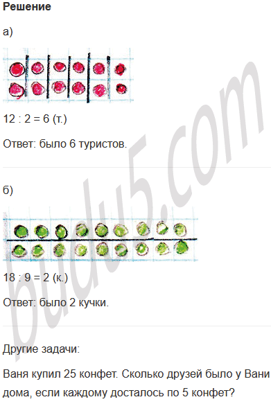 б) 18 шариков разложили в кучки по 9 шариков в каждой. Сколько получилось кучек?