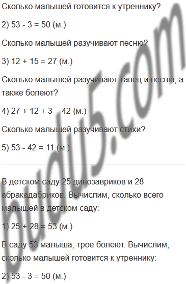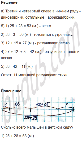 б) В детском саду страны фантазёров 25 динозавриков и 28 абракадабриков. Трое малышей болеют, а остальные готовятся к утреннику, причём каждый из них занят одним делом. Танец разучивают 12 зверят, песню - на 15 зверят больше, а остальные учат стихи. Сколько малышей разучивают стихи?