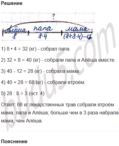 Задание № 58. Алёша собрал 8 кг лекарственных трав, его папа - в 4 раза больше Алёши, а мама - на 12 кг меньше, чем Алёша и папа вместе. Сколько всего килограммов лекарственных трав собрали они втроём? Во сколько раз больше трав набрала мама, чем Алёша?