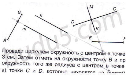 Задание № 94. Проведи циркулем окружность с центром в точке А и радиусом 3 см. Затем отметь на окружности точку В и проведи вторую окружность того же радиуса с центром в точке В. Отметь: