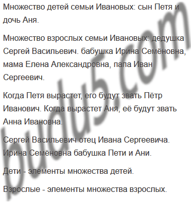 Из каких элементов состоит множество детей этой семьи, множество взрослых этой семьи? Как будут звать Петю, когда он вырастет? Как будут звать Аню? Чьим отцом является Сергей Васильевич? Чьей бабушкой является Ирина Семёновна?