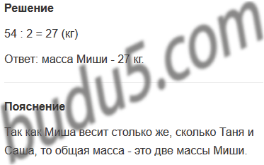 Задание № 10. Общий вес Миши, Саши и Тани равен 54 кг. Миша весит столько же, сколько Саша и Таня вместе. Сколько весит Миша?